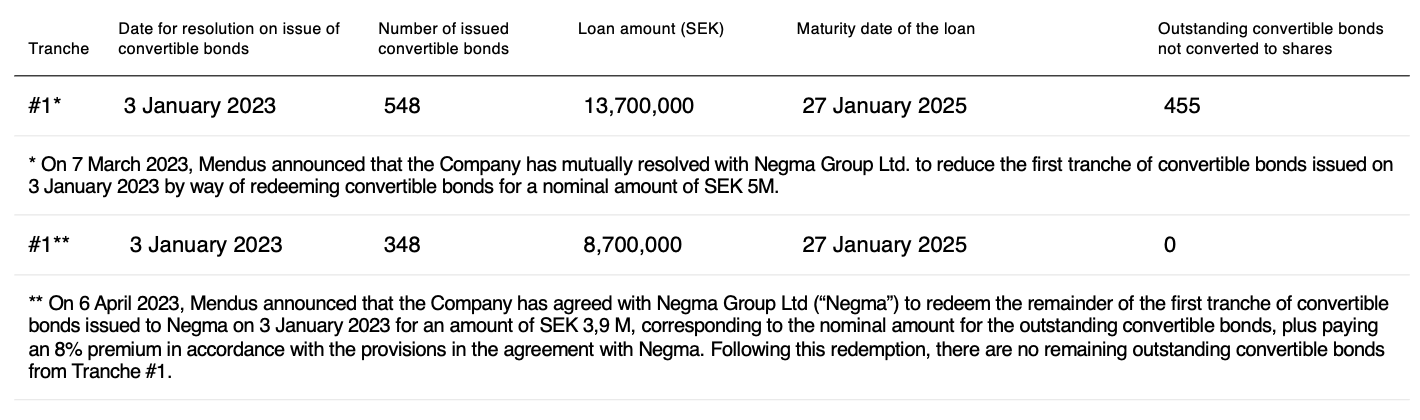 On 26 August 2022, Mendus entered into a financing arrangement with Negma Group (“Negma”), in which Negma has committed to subscribe to up to SEK 200 million in convertible bonds. As of 6 April 2023, there were no remaining outstanding convertible bonds to Negma and in connection with the capital raise during June – July 2023, the company entered into an agreement where Mendus has undertaken towards Pareto Securities AB not to exercise any further financing from the Negma arrangement.
