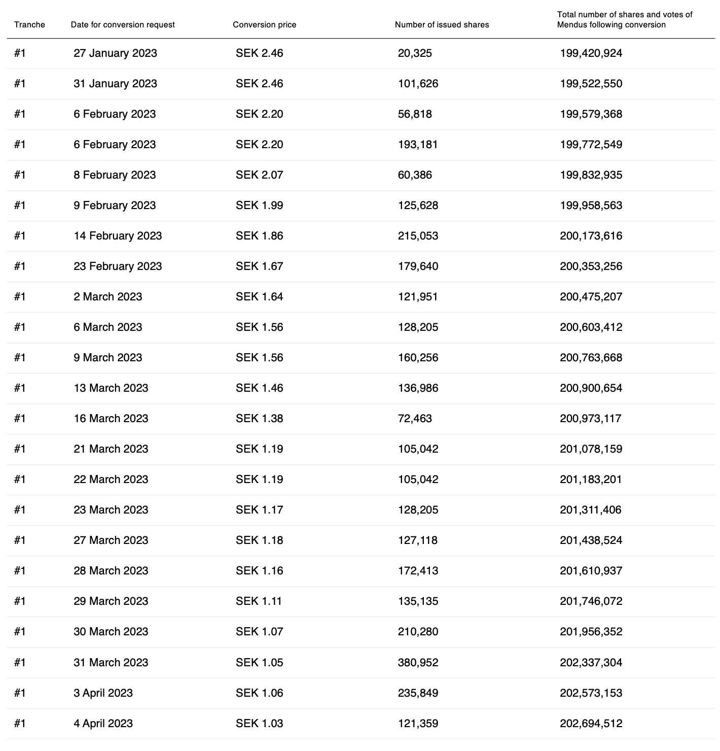 Please refer to the press releases published on 26 August 2022, 26 October 2022, 5 January 2023, 7 March 2023, 6 April 2023 and 8 June 2023 for more information regarding the financing agreement. The table below presents the convertible bonds and shares that were issued under the financing arrangement during January – April 2023.